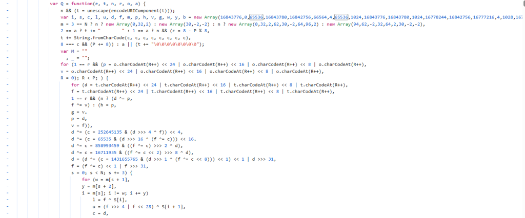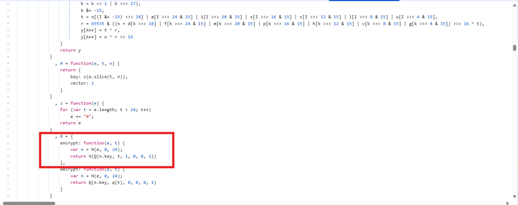 根据代码逻辑将其中的H,z函数抠出,继续下一步,其中的V函数是一个window.btoa,而Q函数就是主要的加密函数了,