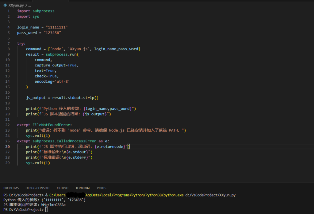 将这个部分的代码扣出,本地vscode运行可见,其中XXyun.js就是我们扣出的加密函数,运行后的结果如图